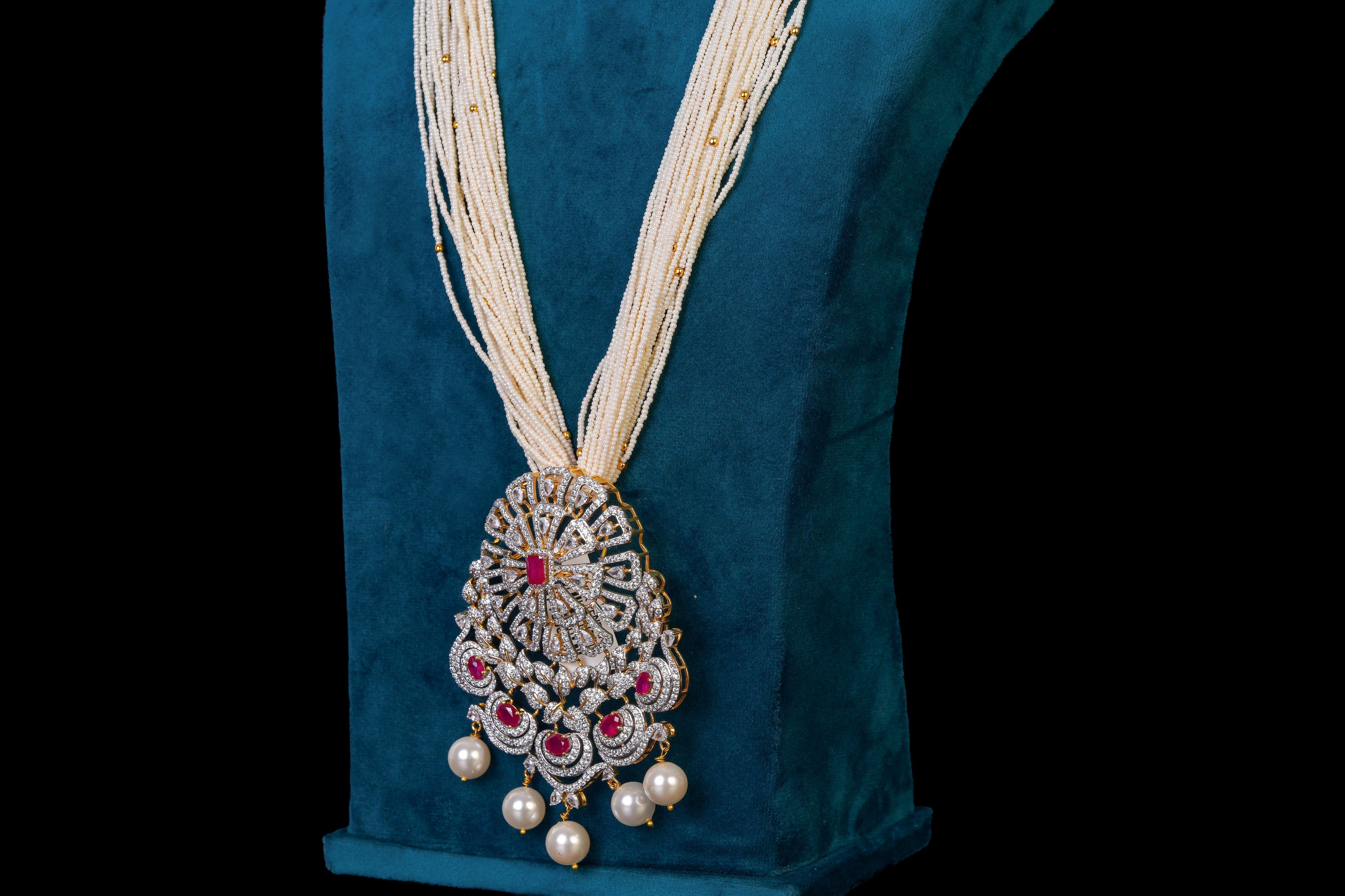 This elegant necklace features lustrous pearls and sparkling diamonds delicately arranged on a blue stand, creating a stunning visual contrast. The centerpiece of the necklace is a silver pendant, adding a touch of sophistication to the overall design. Perfect for formal occasions or as a statement piece for everyday wear, this necklace is a timeless addition to any jewelry collection.
