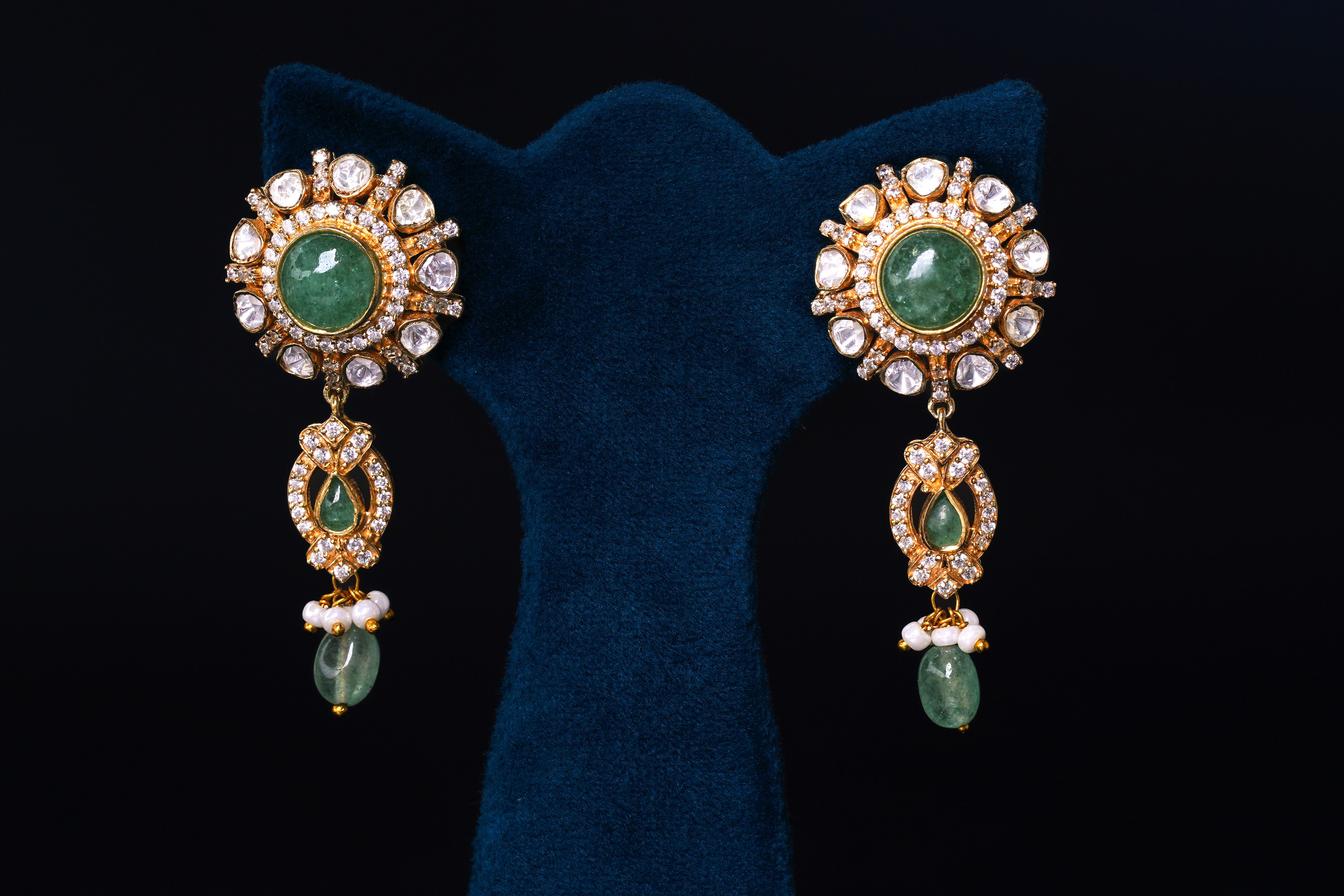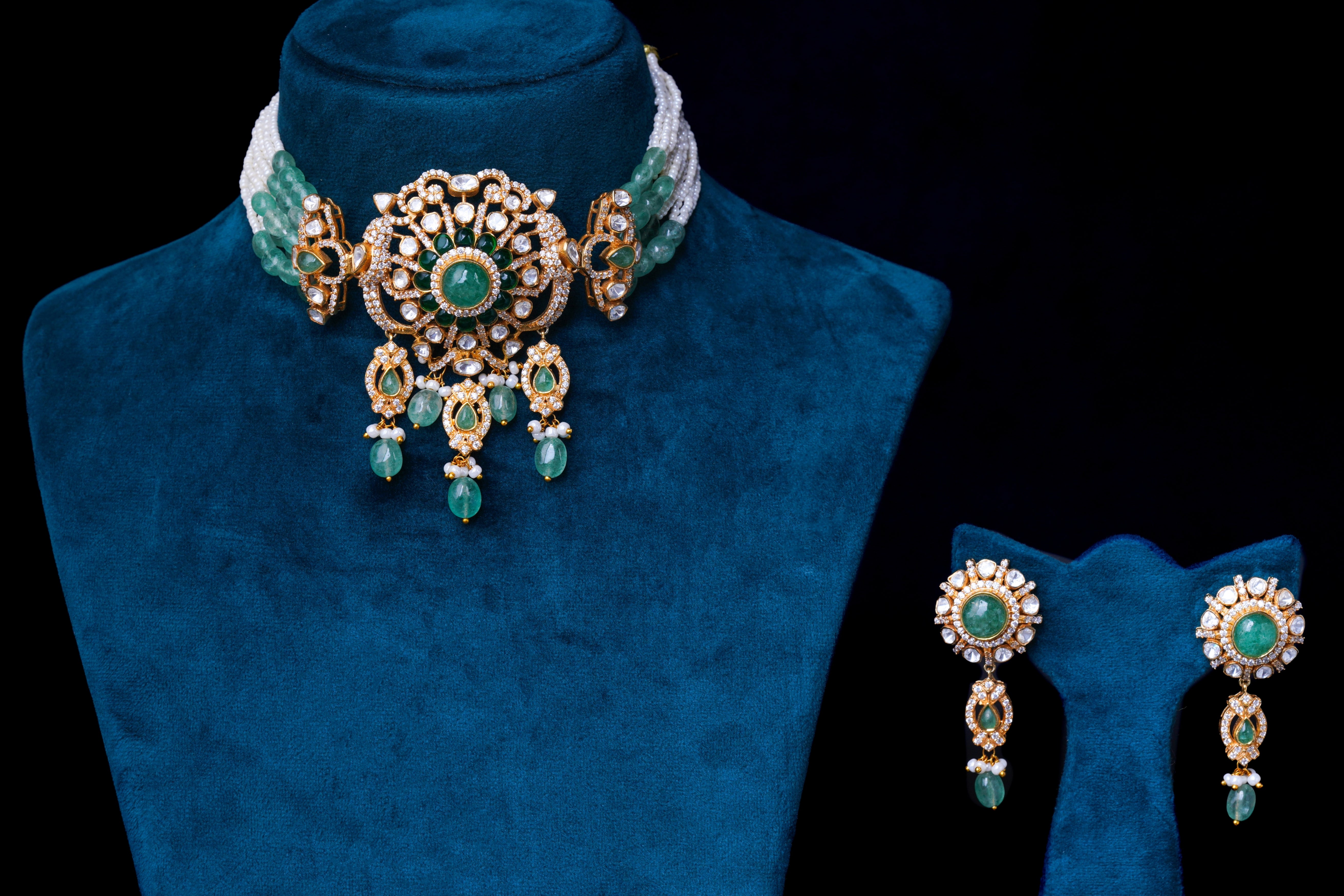 This polki green set with pearl is a stunning addition to any jewelry collection. With its unique design and high-quality materials, it exudes elegance and sophistication. The lush green polki stones and lustrous pearls add a touch of glamor, making it the perfect accessory for any occasion. Elevate your style with this one-of-a-kind set.