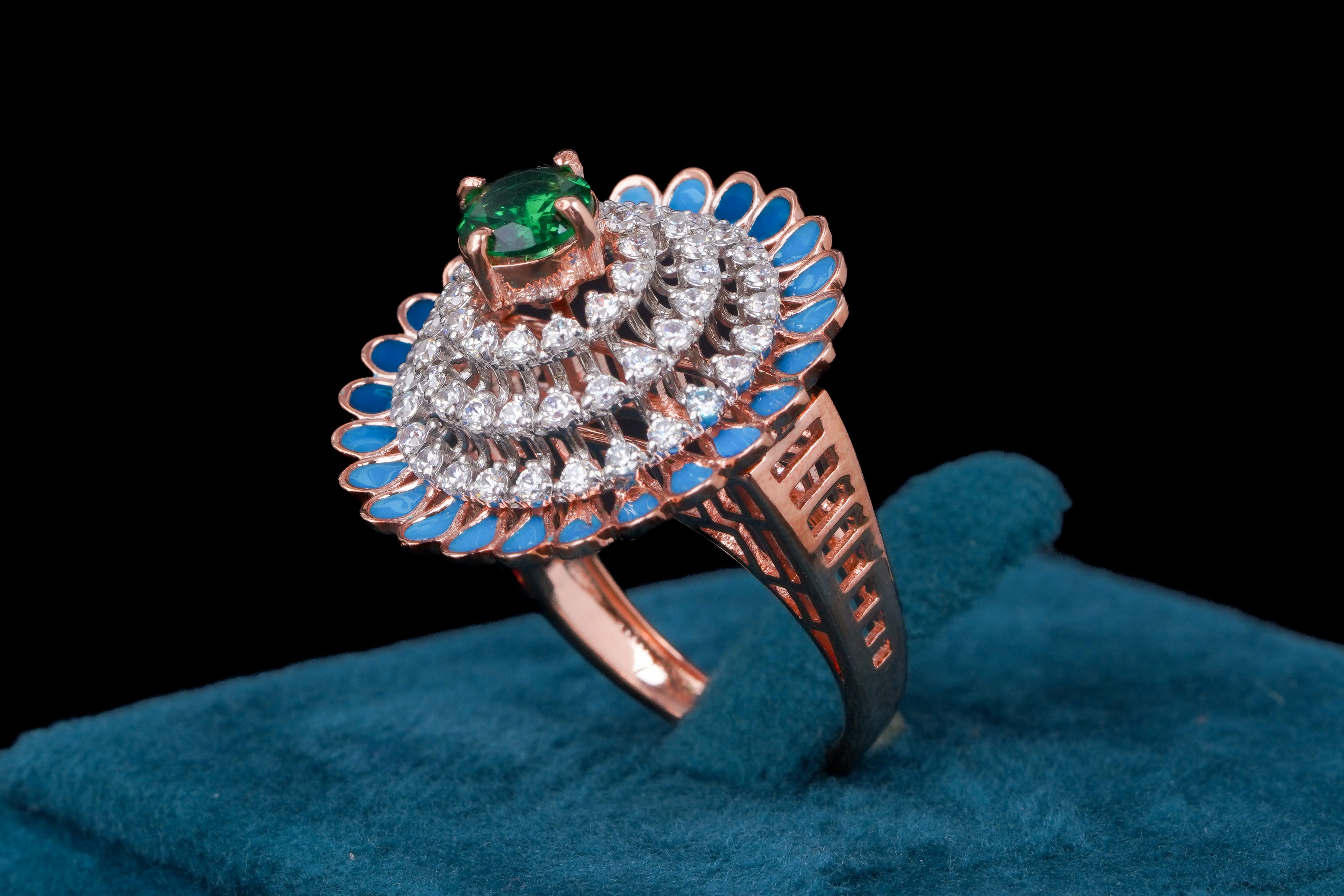 This exquisite ring features a stunning arrangement of green and white diamonds, elegantly set to create a captivating visual appeal. The harmonious blend of colors enhances the ring's sophistication, making it a perfect accessory for any occasion. Crafted with precision, this piece is designed to stand out while offering a timeless elegance that complements both casual and formal attire.