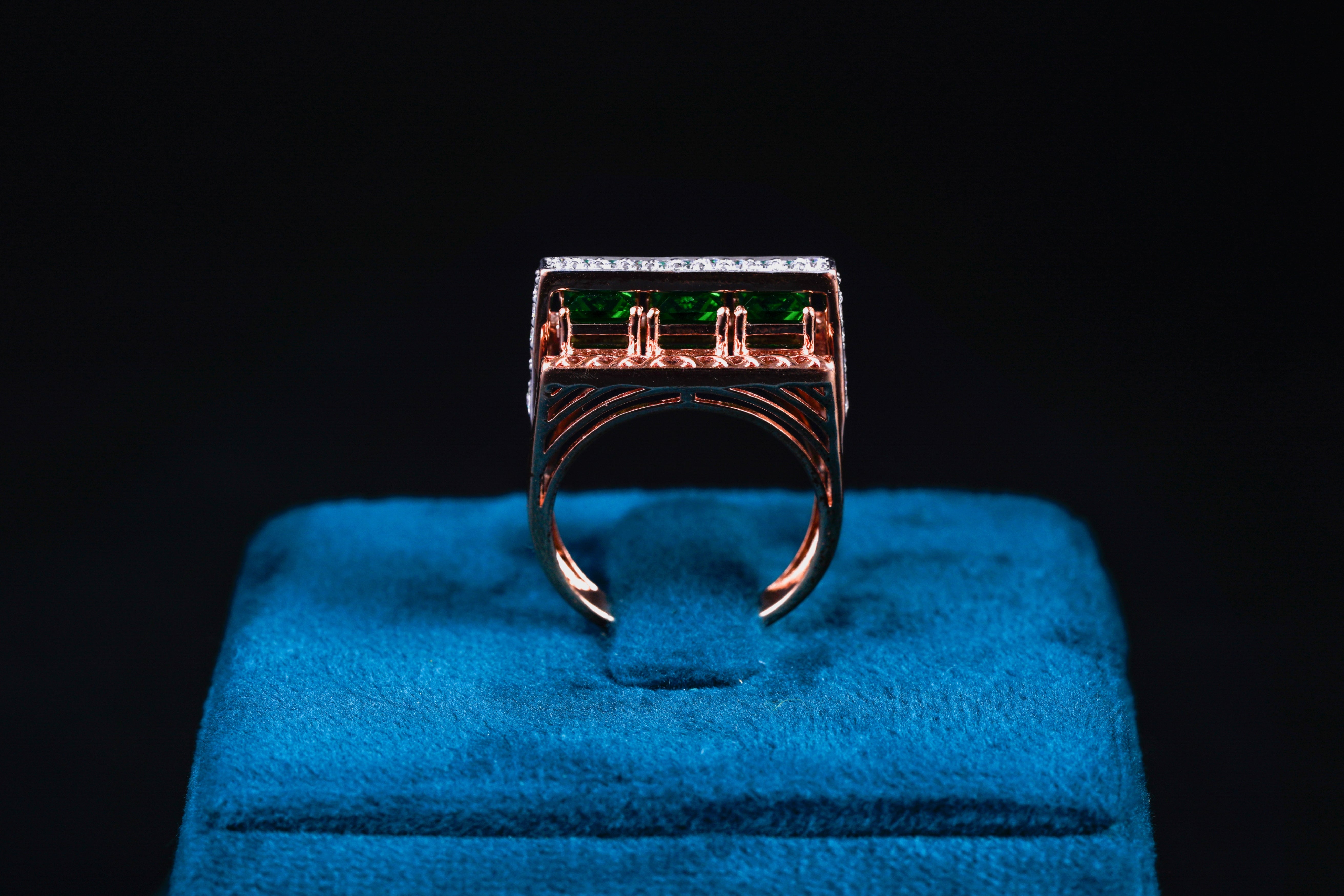 This elegant ring features a vibrant green stone set in a rosegold plated ring, designed to sit upright on your finger. A beautiful addition to any jewelry collection, this ring adds a touch of sophistication and color to any outfit.