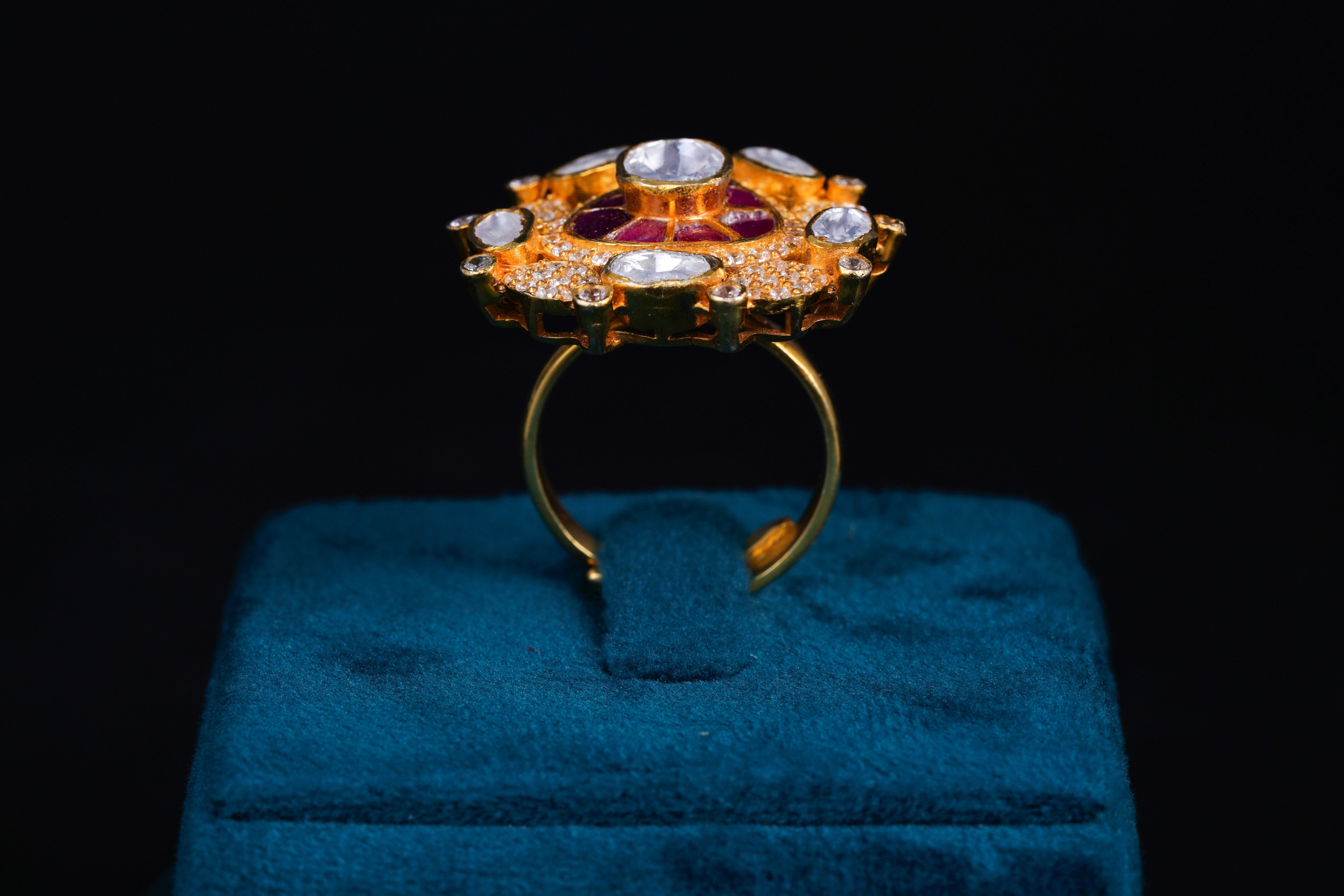 This ruby and polki stone ring boasts a stunning drop-shaped design. Expertly crafted, it showcases exquisite stones that radiate elegance and sophistication. Perfect for special occasions or adding a touch of luxury to any outfit. Guaranteed to make a statement.