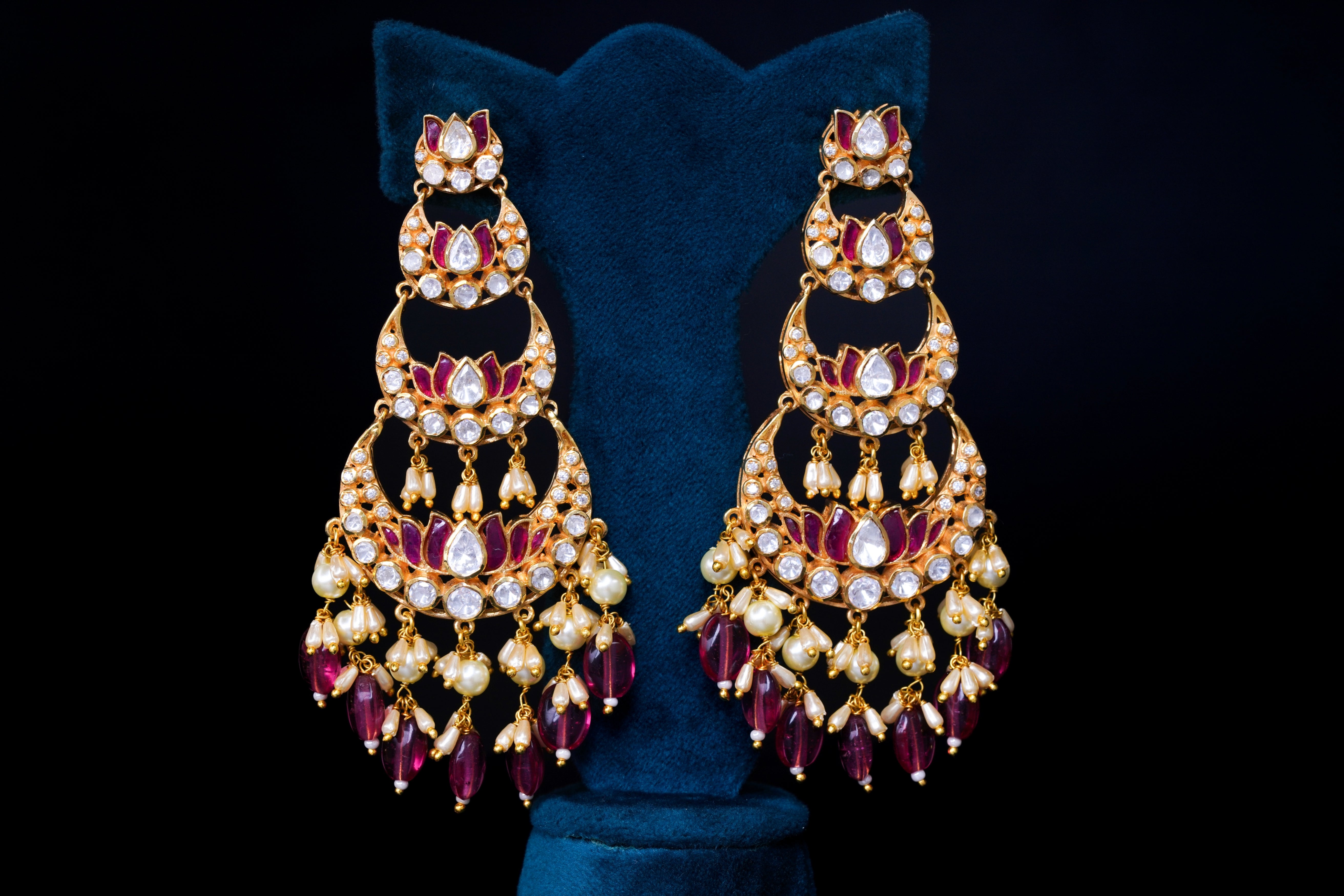 Designed to perfection, these silver earrings feature sparkling Polki stones arranged in an ornate pattern. Their bold yet elegant design is perfect for creating a statement look for traditional events. Their chandbali-inspired design ensures they stand out, whether paired with ethnic or fusion wear.
