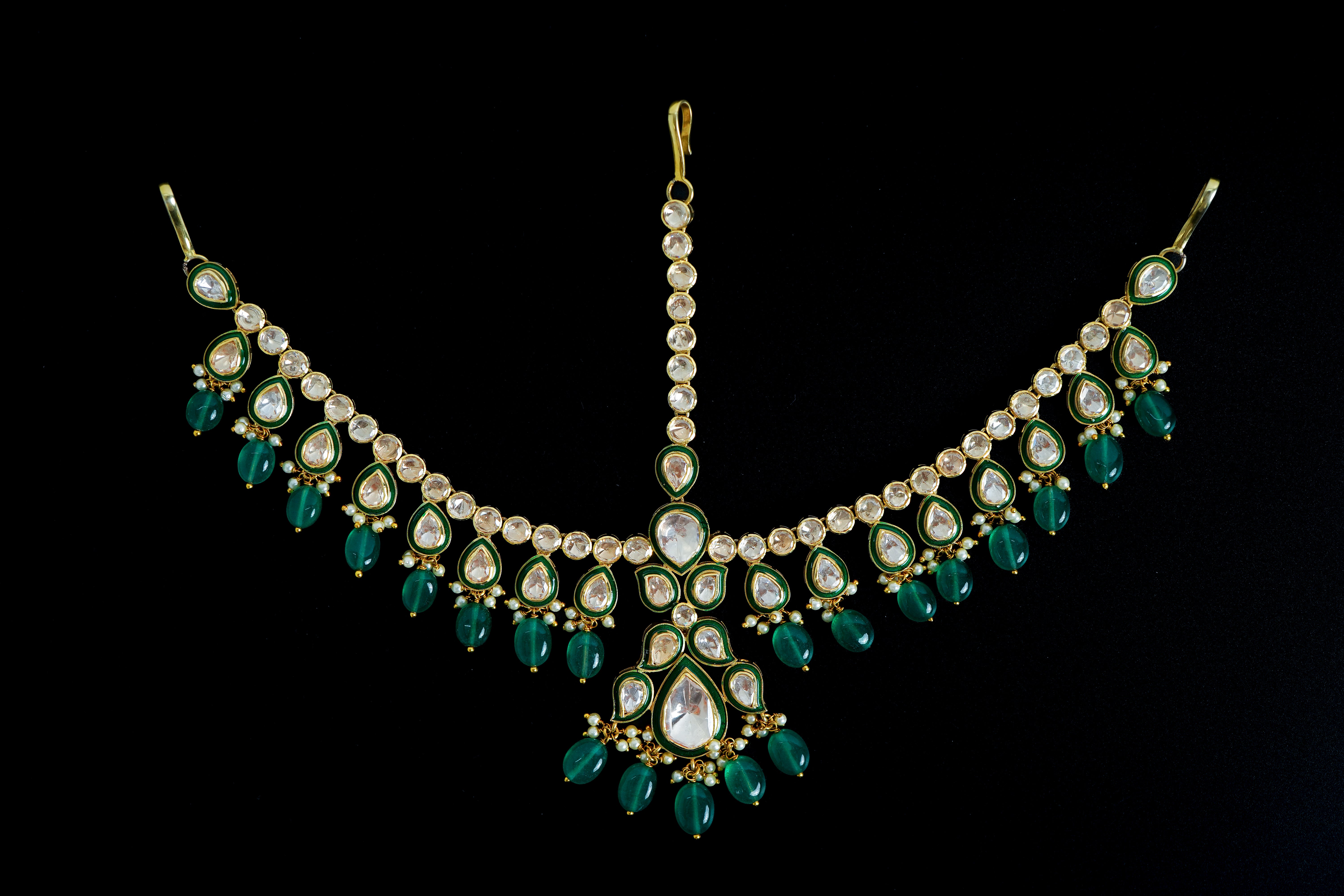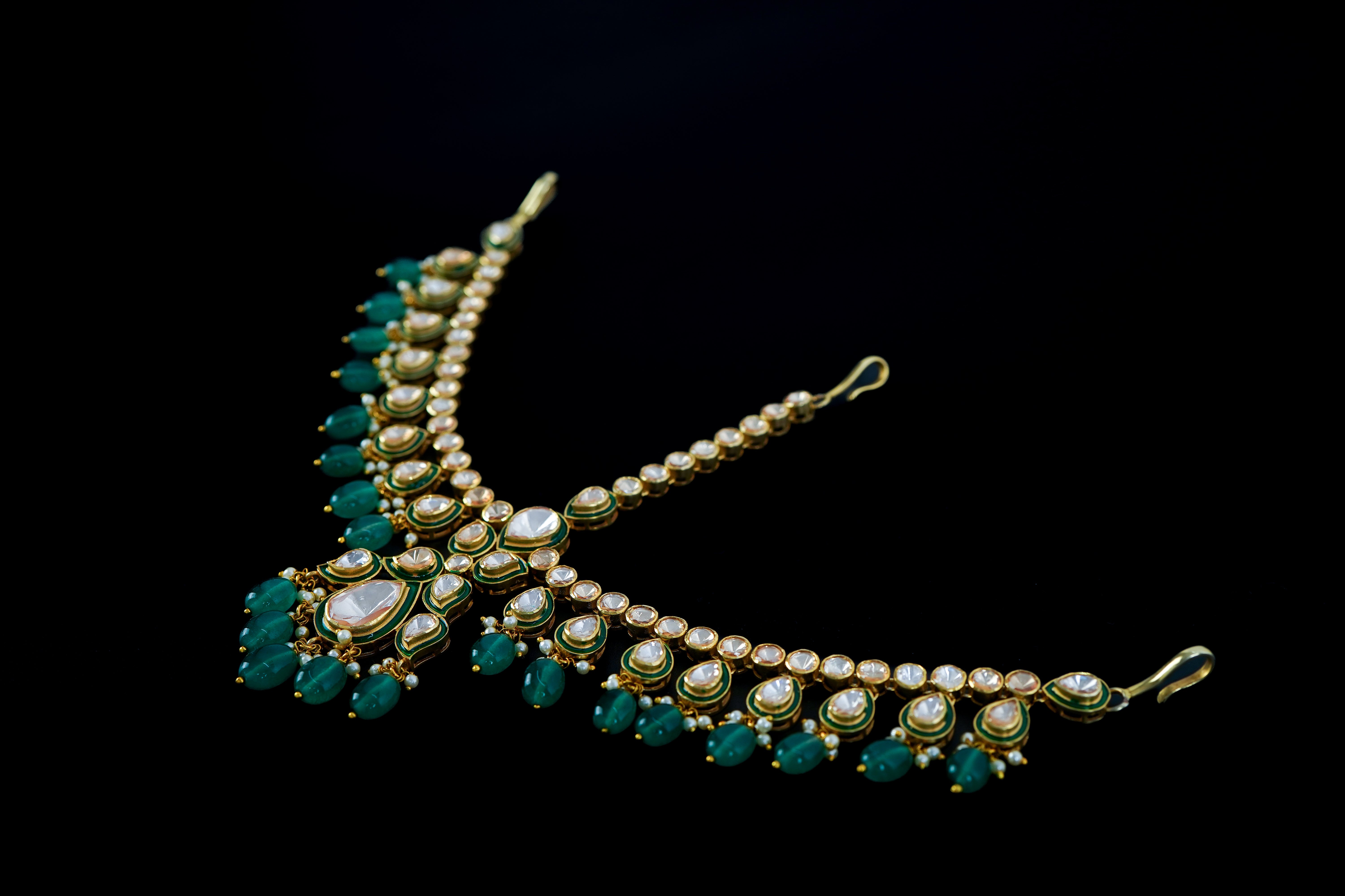 Elevate your elegance with our Green Bridal Polki Mangtika from Khaitan Jewels. This exquisite mangtika features a captivating green design, combining the richness of gold with the allure of pearls. The mangtika is meticulously crafted with precision and attention to detail, showcasing the fine craftsmanship that Khaitan Jewels is renowned for. The combination of green and gold creates a striking contrast, exuding charm and sophistication. With a weight of 65 grams, this mangtika offers both style and comfort, allowing you to wear it with ease throughout the day for special occasions. It is a testament to the brand's commitment to creating exceptional pieces that stand the test of time. Embrace the elegance and sophistication that this necklace brings and let it become a cherished part of your jewelry collection.