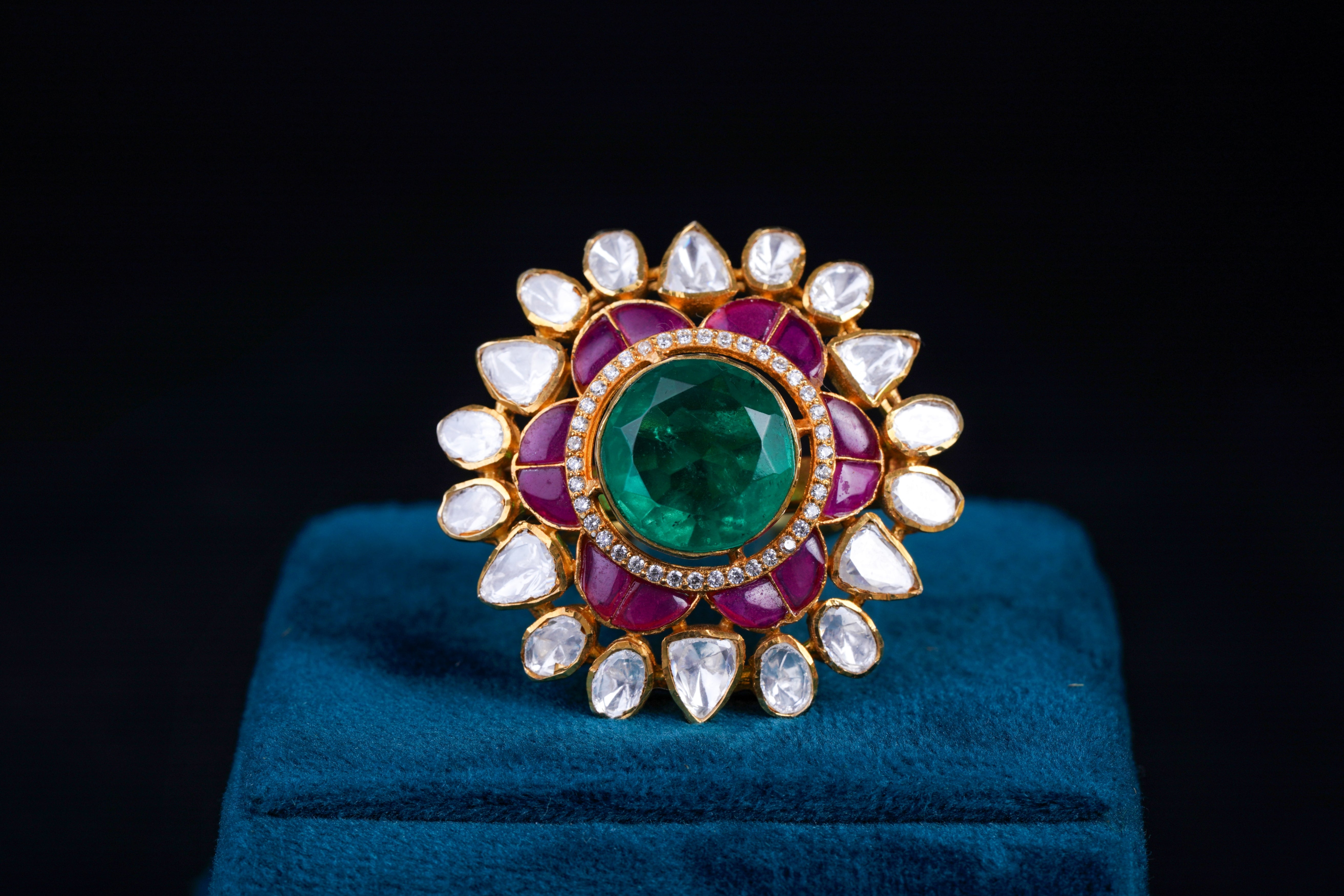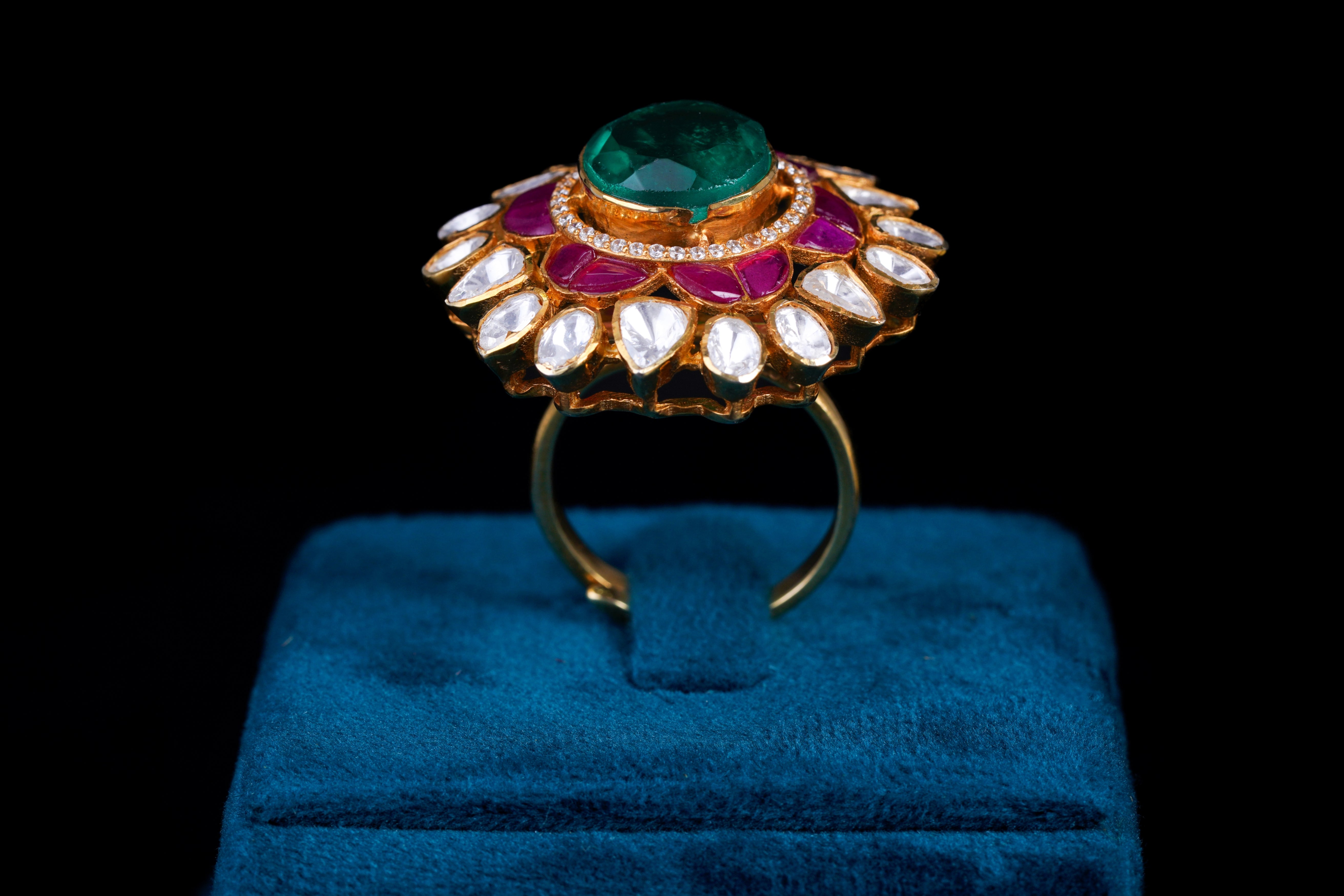 Every detail of this Polki ring is a testament to fine craftsmanship and unbridled luxury. This bold statement ring draws inspiration from royal treasures, making it a perfect choice for weddings, grand celebrations, or to elevate any luxurious outfit. Its geometric precision combined with the natural brilliance of Polki diamonds creates a timeless allure that is impossible to ignore.