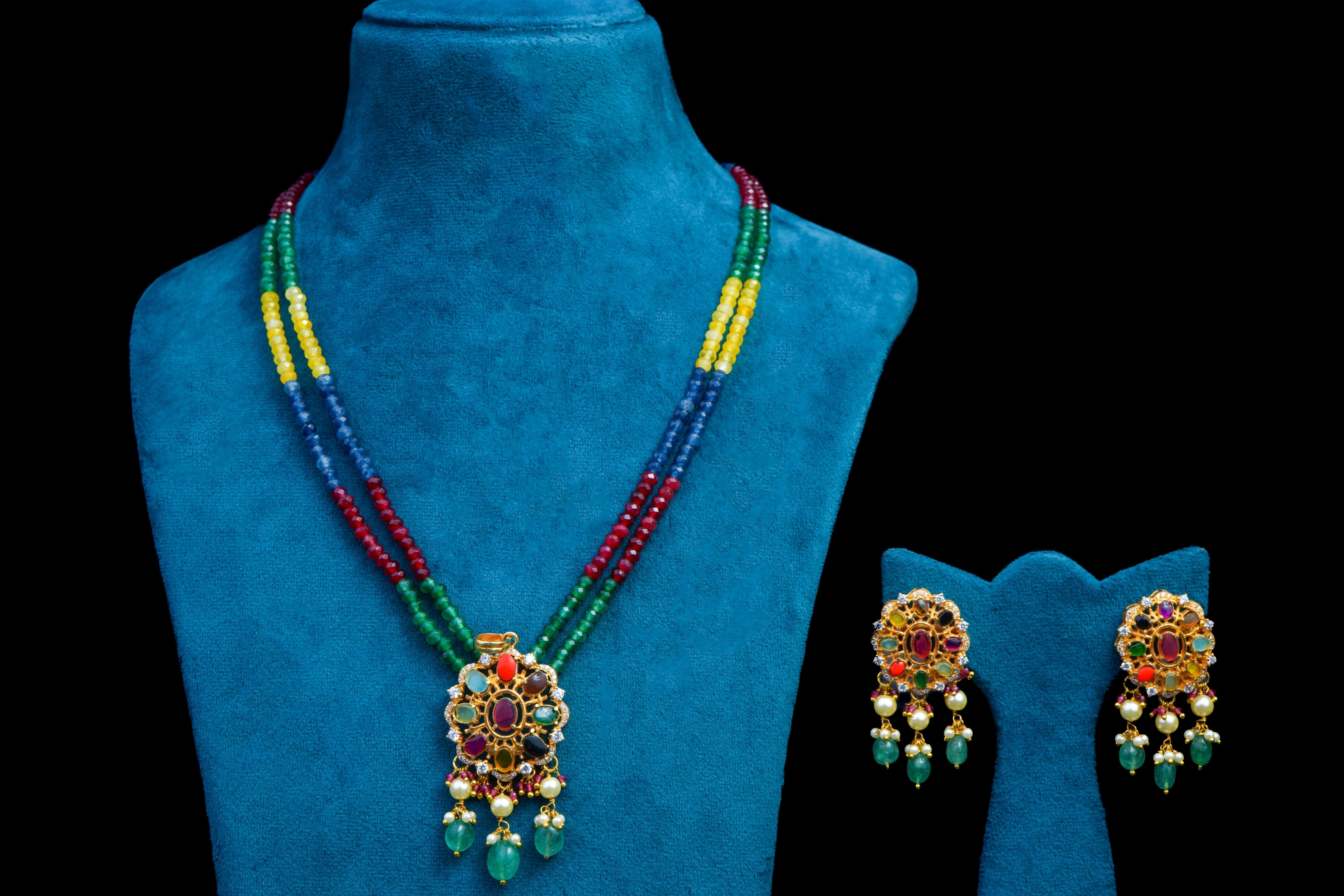 This stunning handcrafted Navratna necklace set is a vibrant celebration of tradition and heritage, featuring an exquisite combination of nine precious gemstones that symbolize prosperity, protection, and positivity. The multi-strand beaded necklace incorporates rich hues of red, blue, green, and yellow, leading to a magnificent gold pendant adorned with intricate Kundan work, delicate pearls, and emerald bead drops. The matching earrings mirror the pendant’s grandeur, with a regal arrangement of rubies, sapphires, emeralds, pearls, and more, framed in a traditional gold-polished setting with dangling beads, adding a graceful movement to the design.