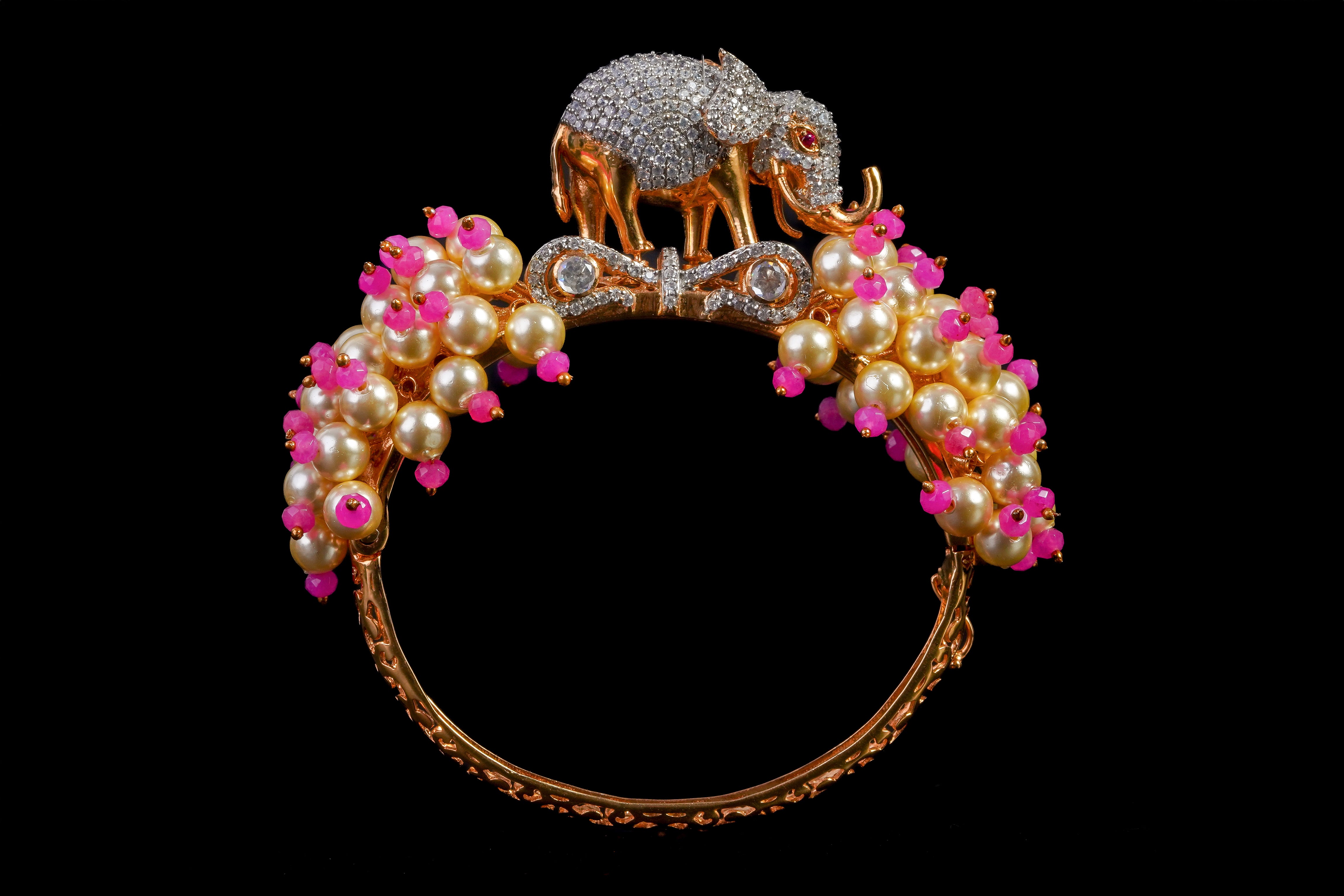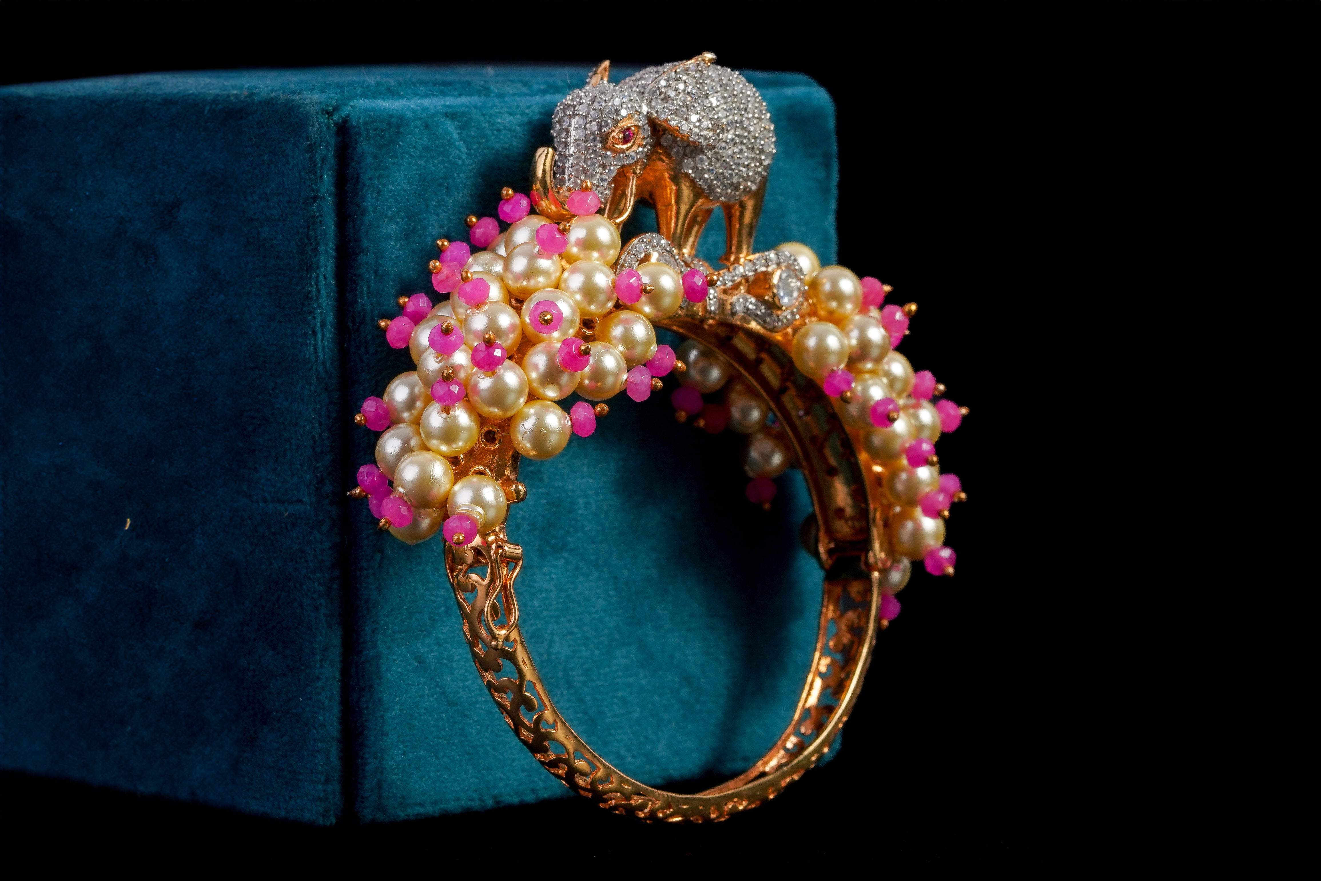 This elegant bracelet features a charming pink and white design adorned with a combination of diamonds and pearls. The silver bracelet showcases a delicate elephant motif, perfect for adding a touch of glamour to any ensemble. A charming piece showcasing a diamond and pearl design on a silver elephant charm. This bracelet is sure to make a statement and become a timeless addition to your jewelry collection.