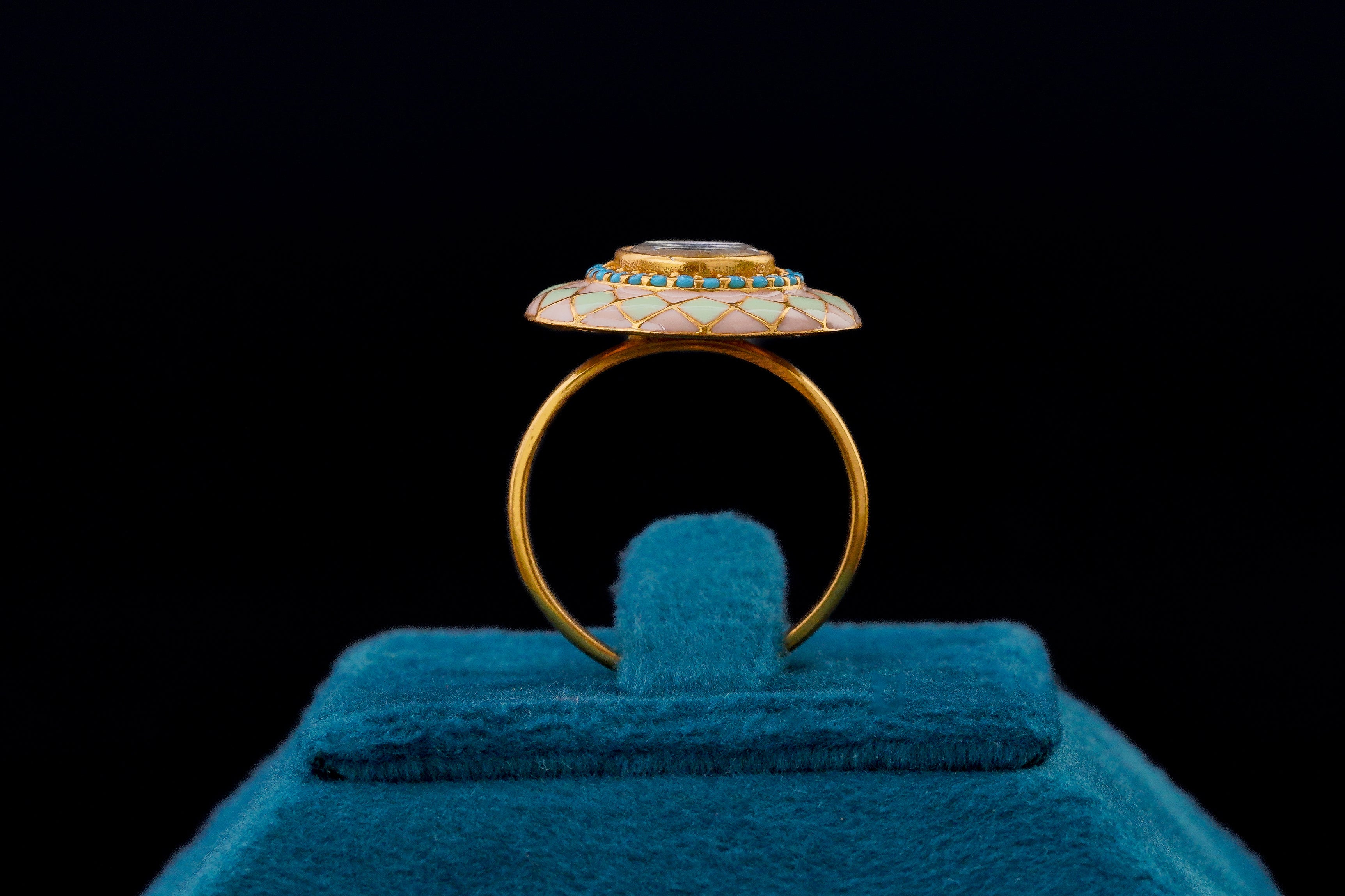 This exquisite silver kundan ring with mina detailing is a stunning piece of traditional Indian jewelry. The intricate design and craftsmanship make it a perfect accessory for special occasions or everyday wear. The combination of kundan and mina work adds a touch of elegance and sophistication to this beautiful ring, making it a timeless addition to any jewelry collection.
