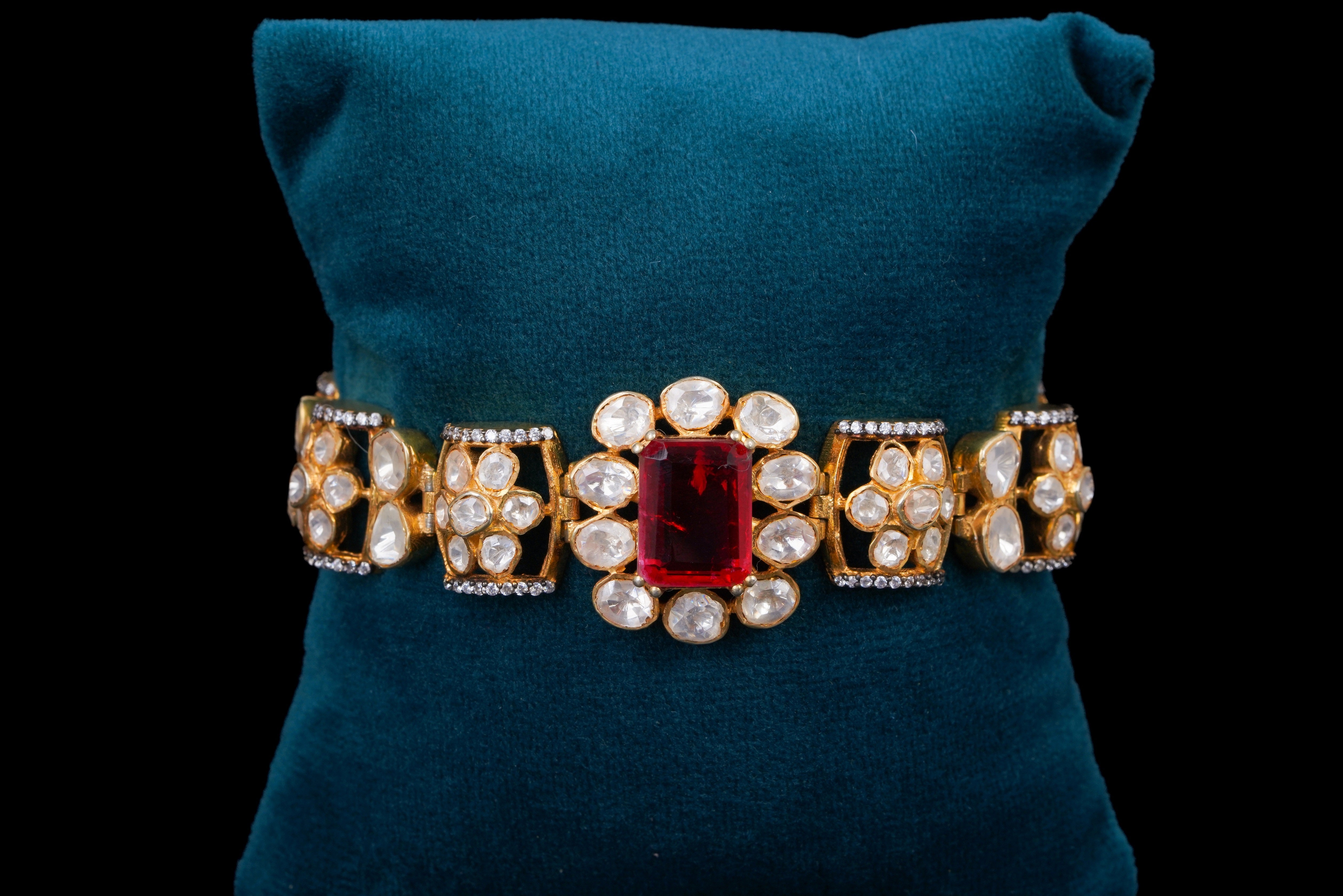 This silver polki bracelet features a stunning arrangement of red stones set against a backdrop of white diamonds, elegantly displayed on a luxurious blue cushion. The vibrant red and white contrast beautifully, making it a striking accessory for any occasion. Its intricate design and craftsmanship highlight the bracelet's sophistication, ensuring it stands out as a statement piece in any jewelry collection.