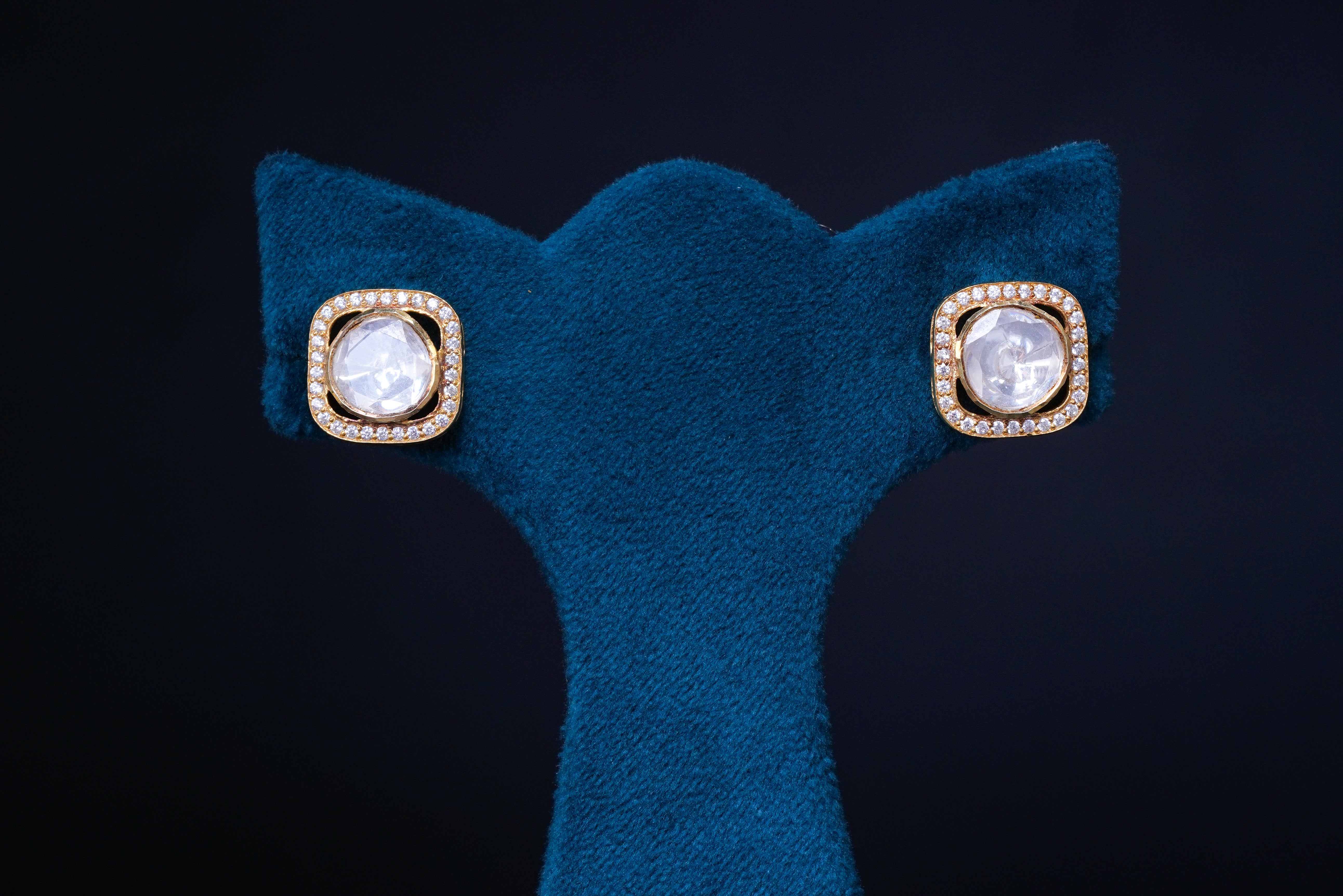 Celebrate the beauty of Polki with these handcrafted square stud earrings in pure silver. Featuring a sparkling Polki stone set within a classic halo design, these earrings combine heritage-inspired aesthetics with modern sensibility.