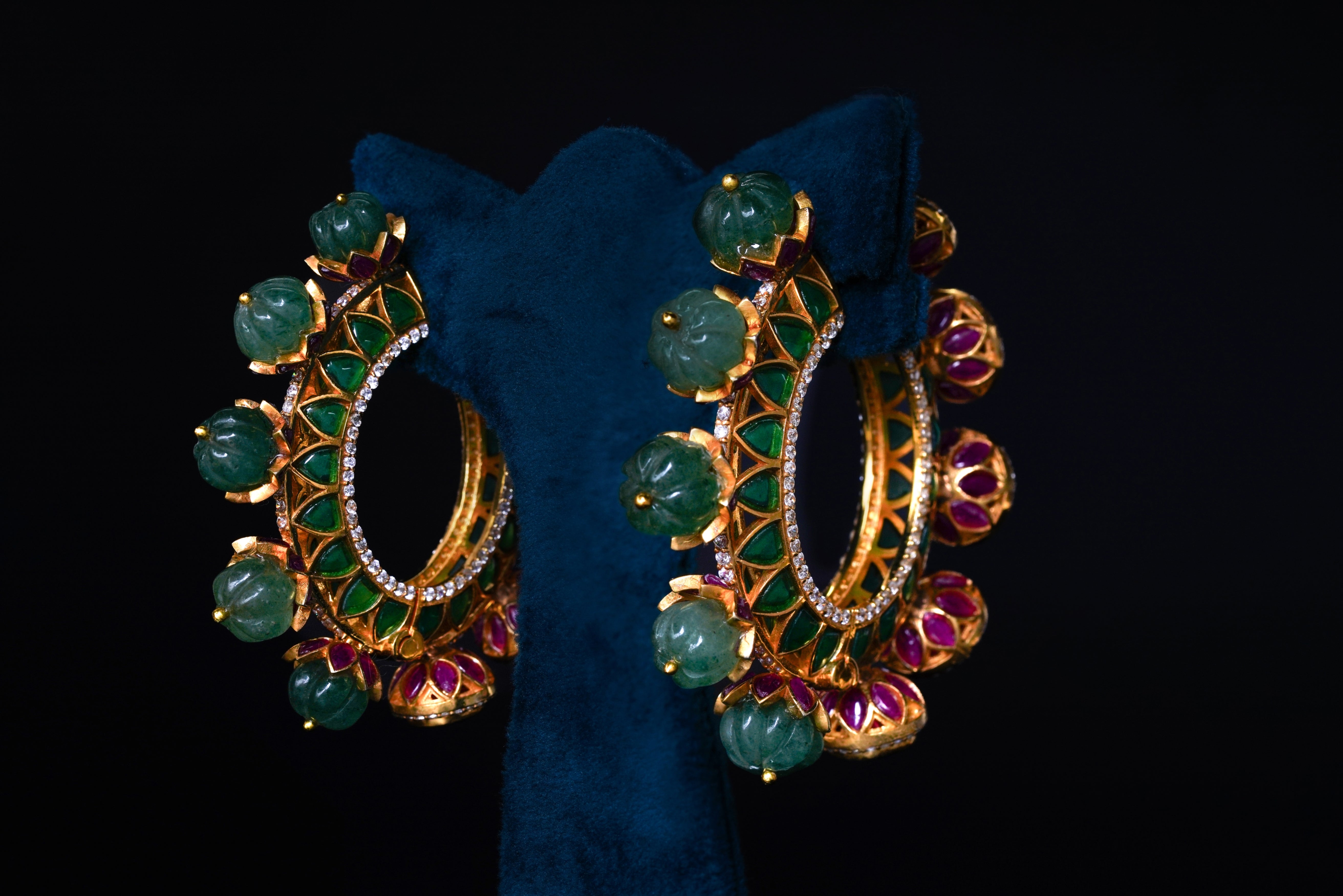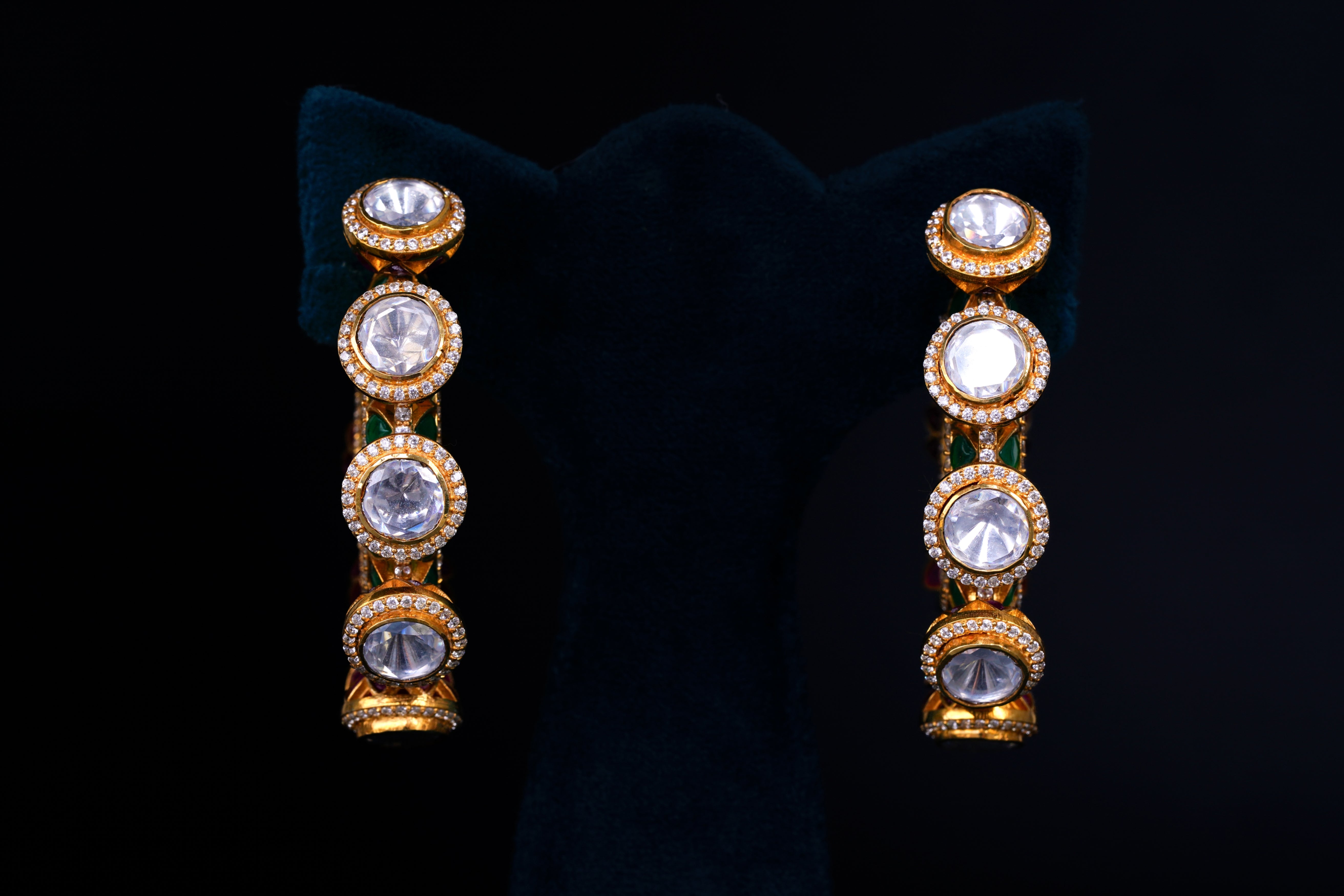 Experience elegance and versatility with these sterling silver balis, featuring radiant green and white Polki stones. Designed for two-way wear, they can be flipped to reveal a different design on each side, making them a unique and stylish accessory for any occasion.