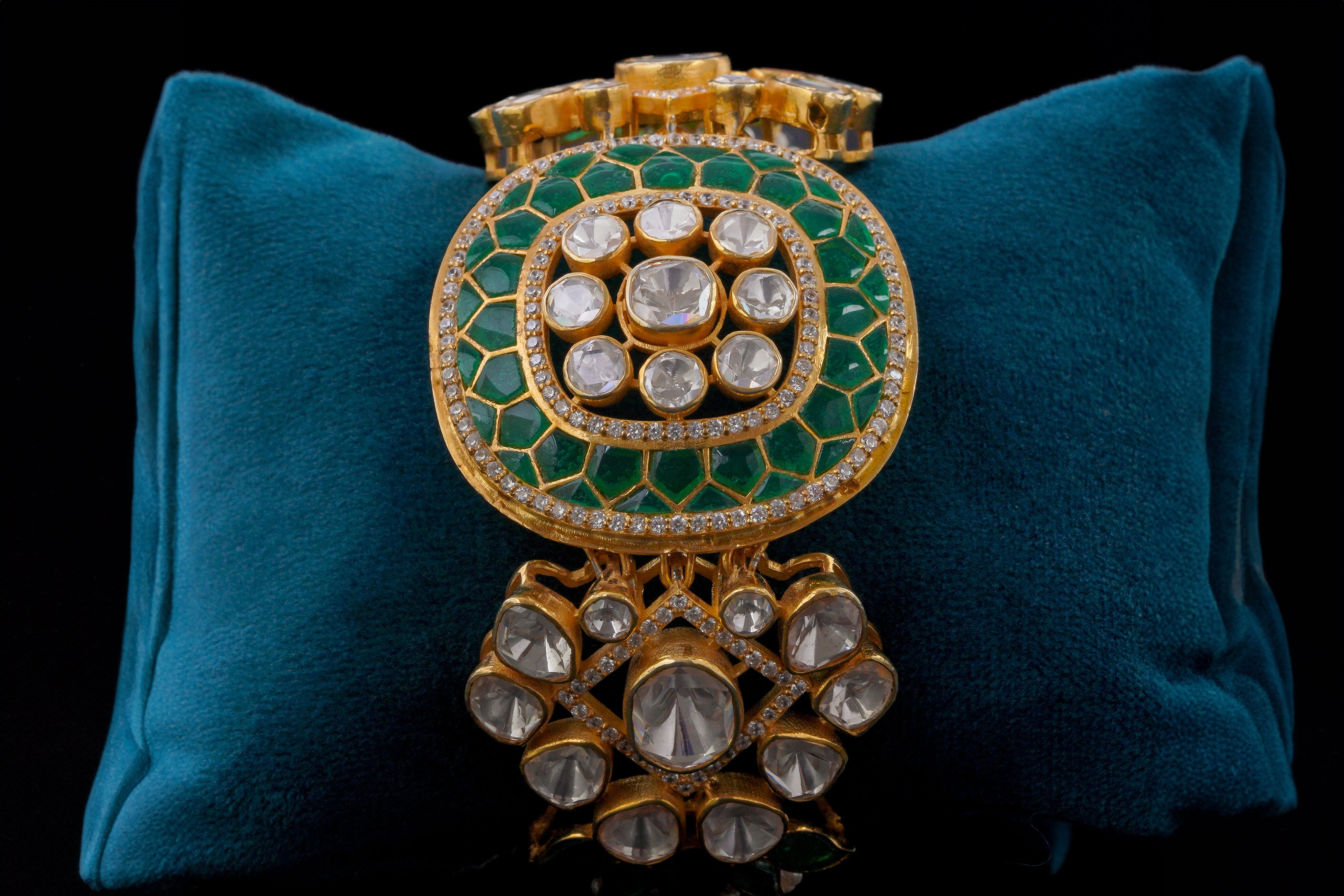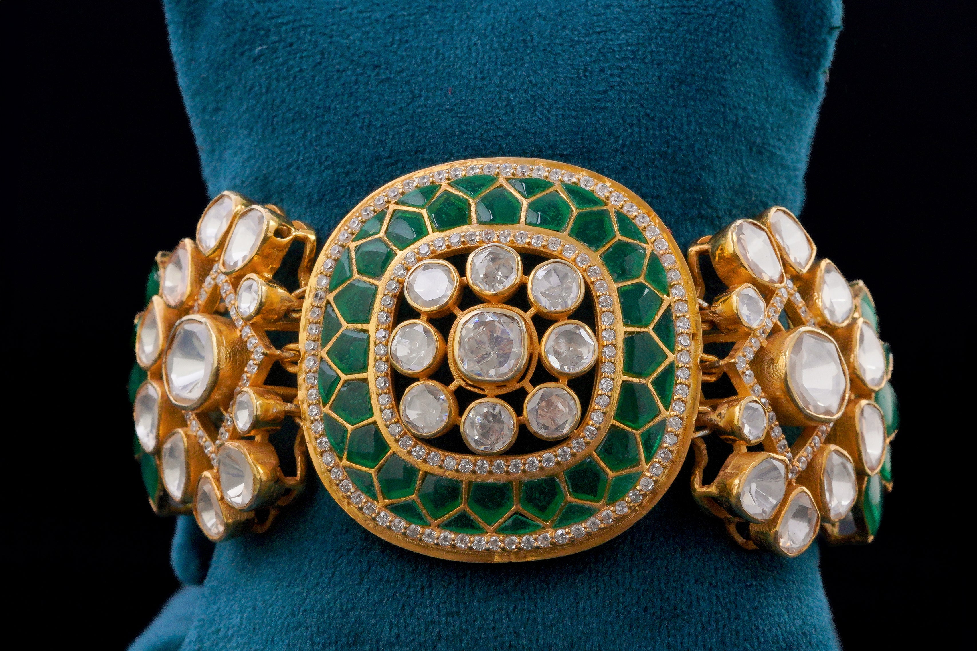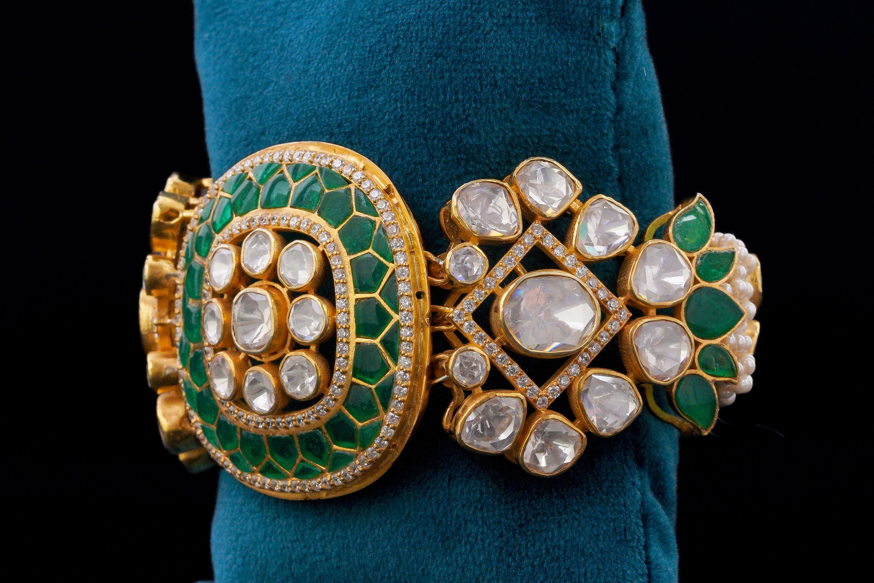 This elegant kundan bracelet, made from sterling silver, adds a touch of sophistication to any outfit. With its intricate design and high-quality materials, it's sure to be a timeless addition to your jewelry collection. Upgrade your style with this expertly crafted piece.