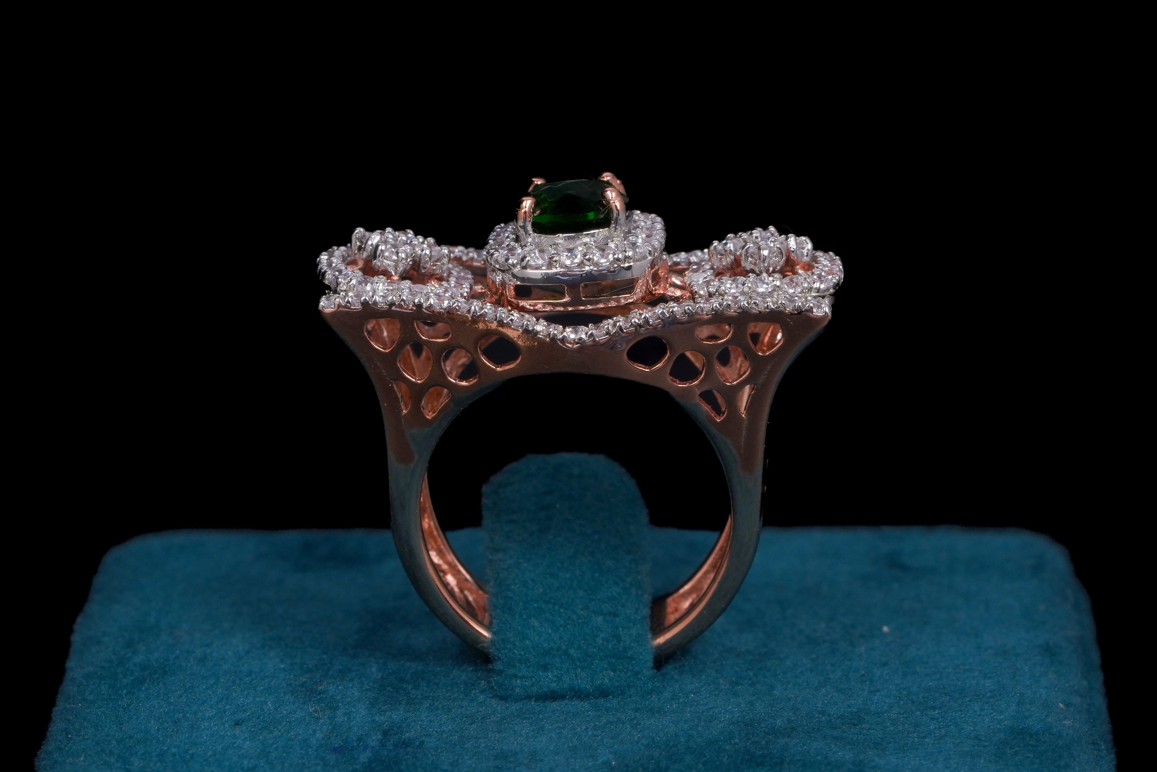 This exquisite green stone and diamond ring is crafted in sterling silver, showcasing a stunning green gemstone at its center, elegantly surrounded by sparkling diamonds. The combination of the vibrant green hue and the brilliance of the diamonds creates a captivating contrast, making this ring a perfect statement piece for any occasion.