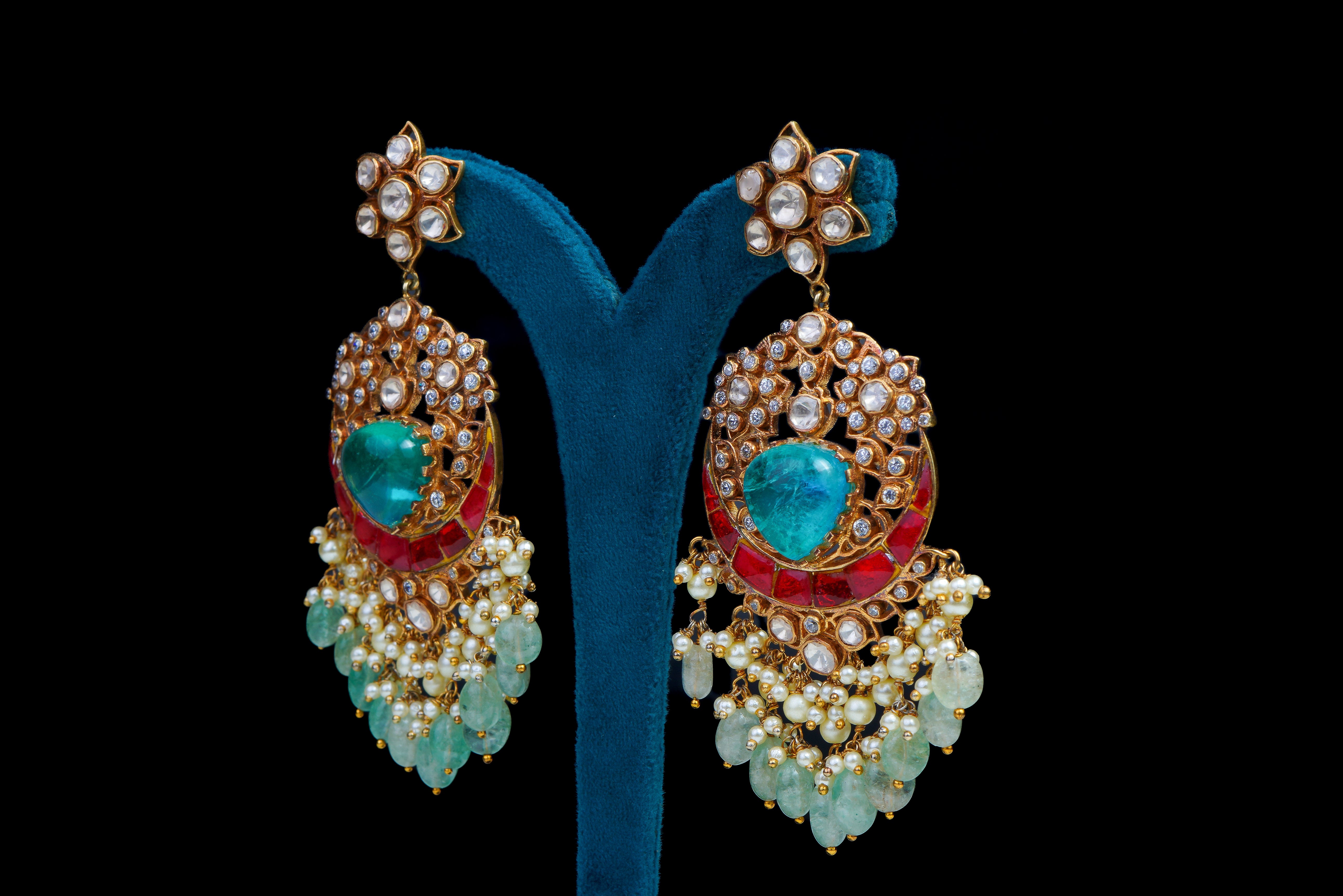 A breathtaking handcrafted Polki and Kundan necklace set, featuring a grand pendant adorned with a deep aqua gemstone at the center. The necklace is strung with pearls and green beads, elegantly complementing the intricate goldwork and rich red meenakari (enamel) detailing. The earrings mirror the pendant's regal design, finished with pearl and bead danglers for an added touch of grace. A celebration of cultural richness, this set is the ultimate statement of elegance and tradition.