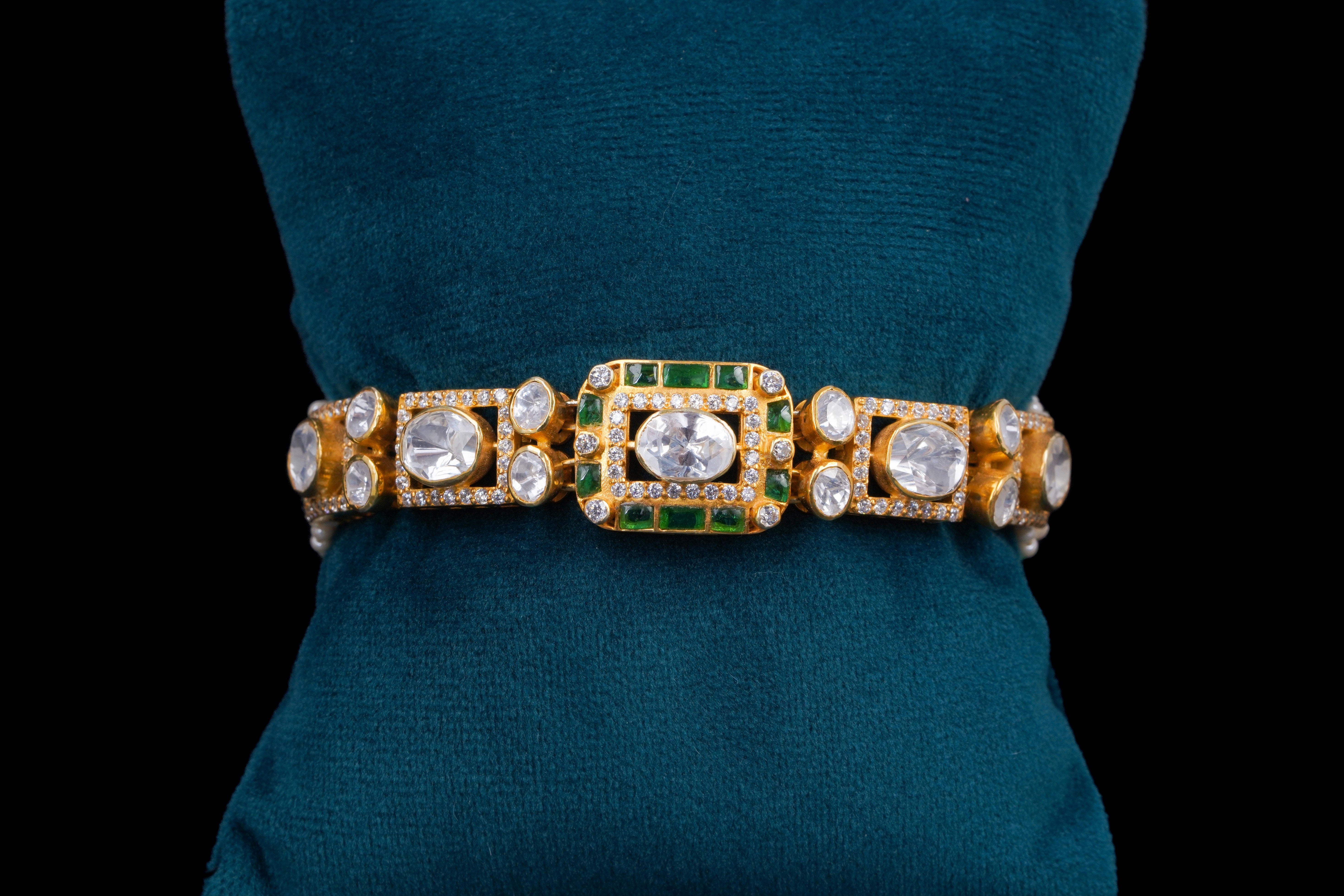 This exquisite silver polki bracelet features a stunning design adorned with radiant emeralds and sparkling diamonds, creating a luxurious contrast against the gleaming gold accents. The intricate craftsmanship highlights the elegance of the gemstones, making it a perfect accessory for both formal occasions and everyday wear. Elevate your jewelry collection with this timeless piece that embodies sophistication and style.
