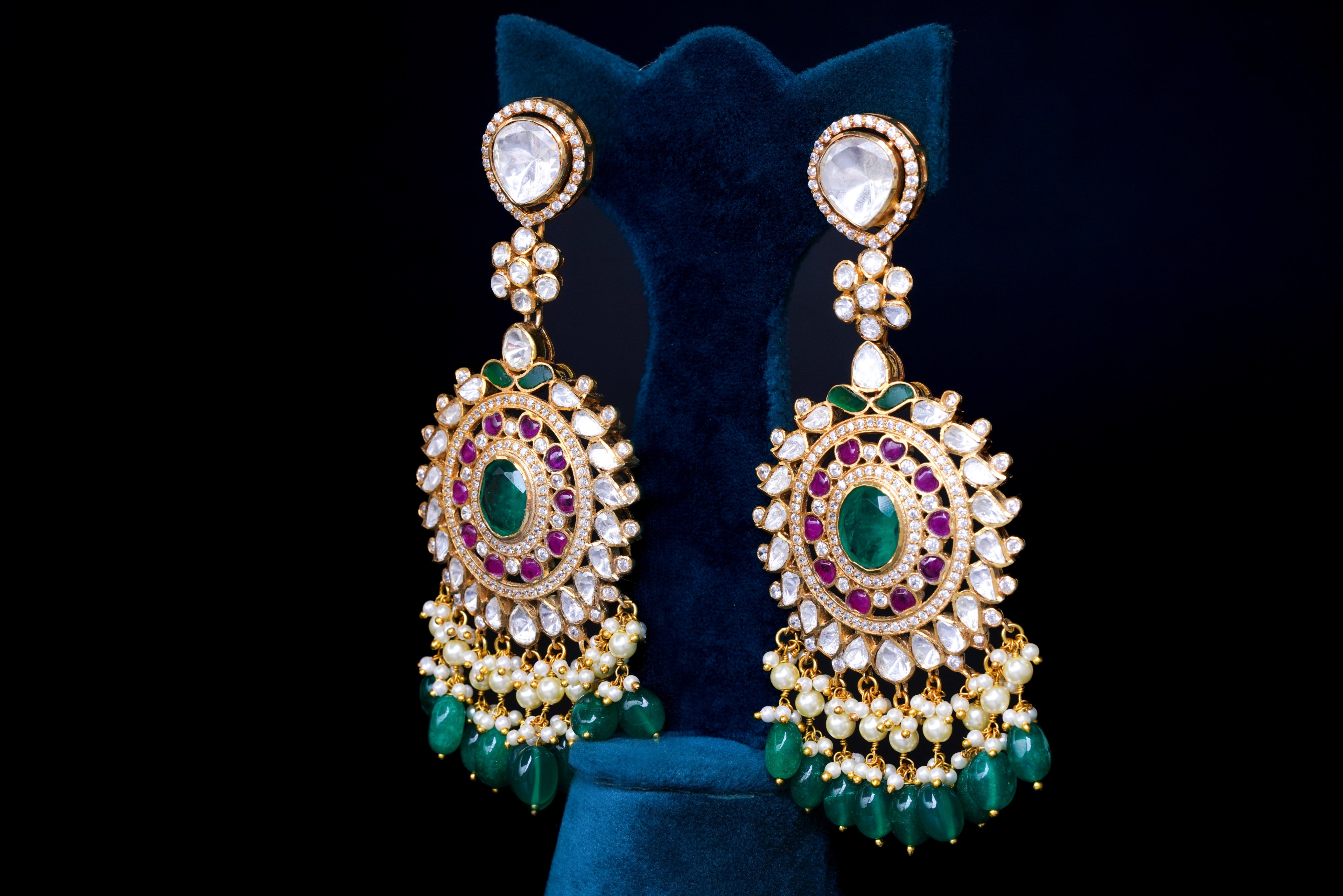 Adorn yourself with these majestic Polki earrings crafted in sterling silver, designed to captivate with their intricate craftsmanship. Featuring a stunning combination of Polki stones, emerald and ruby accents, and delicate pearl fringes, these chandbali-style earrings are the epitome of luxury and tradition. Perfect for weddings and festive occasions, they add an unparalleled touch of elegance to your look.