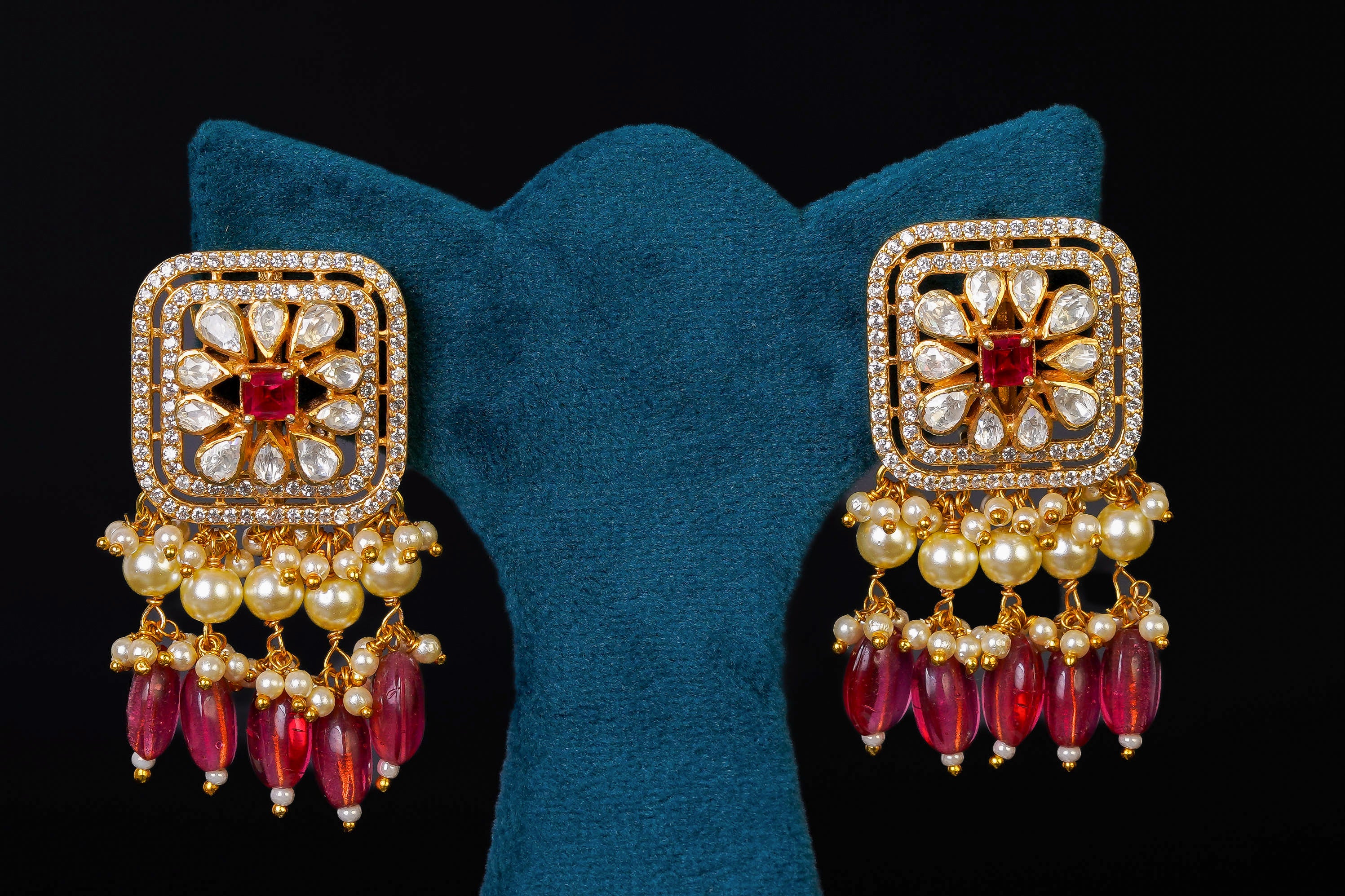 These elegant earrings feature a square silver design with a striking red stone hanging from the bottom. The combination of red and white pearls adds a touch of sophistication and glamour to any outfit. Perfect for both casual and formal occasions, these earrings are a timeless addition to any jewelry collection.