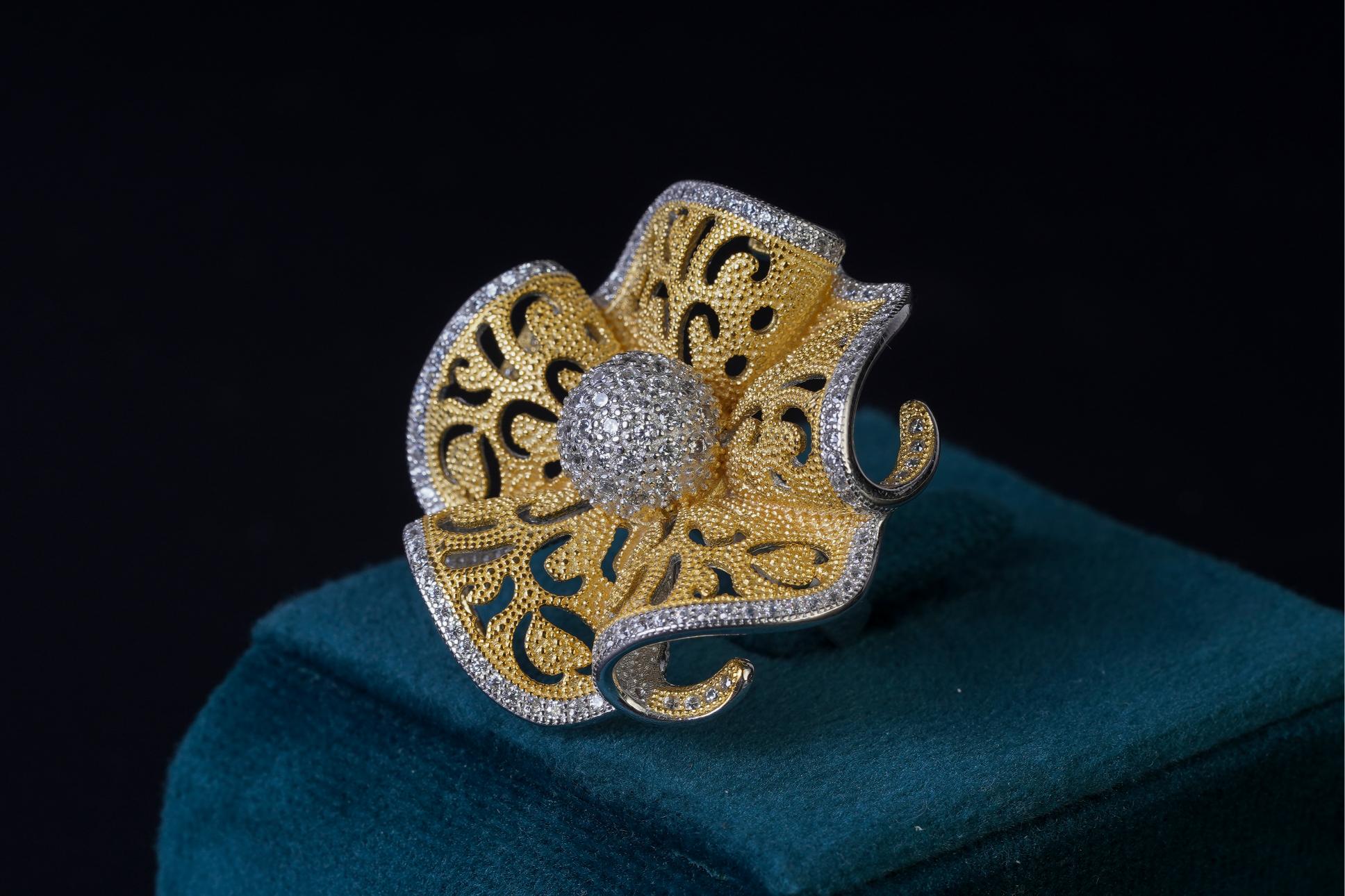 Elevate your elegance with our Women's Silver Golden Flower Ring from Khaitan Jewels. This exquisite ring features a delicate floral design in silver with golden accents, exuding charm and sophistication. Crafted with precision and attention to detail, each piece is a testament to fine craftsmanship. With a weight of 21 grams, this ring offers both style and comfort. Make a statement and experience the timeless beauty of Khaitan Jewels with this stunning ring.
